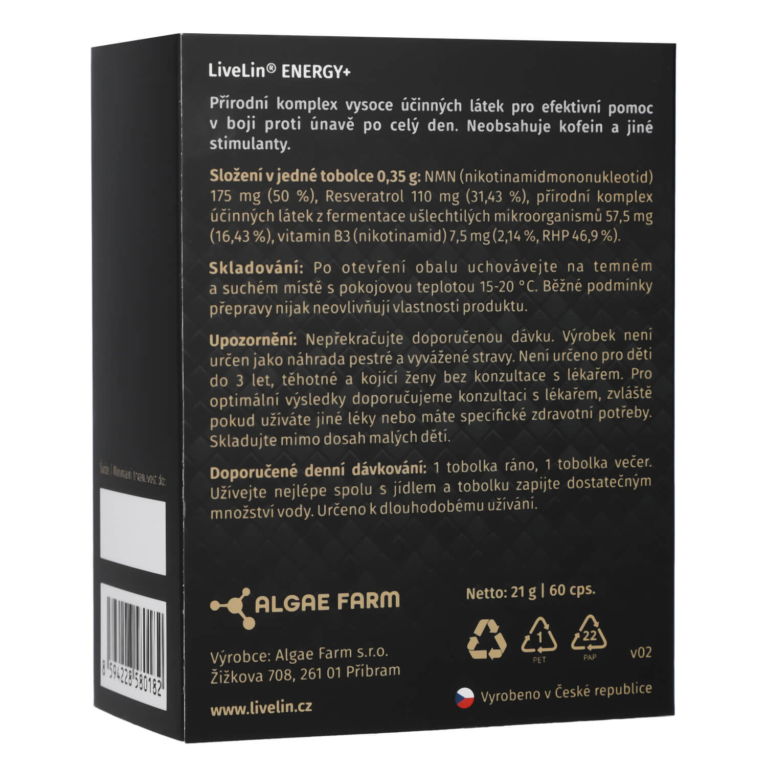 Nepřekračujte doporučenou denní dávku. Výrobek není určen jako náhrada pestré a vyvážené stravy. Není určen pro děti do 3 let, těhotné a kojící ženy bez konzultace s lékařem. Pro optimální výsledky doporučujeme konzultaci s lékařem, zvláště pokud užíváte jiné léky nebo máte specifické zdravotní potřeby. Skladujte mimo dosah malých dětí.
